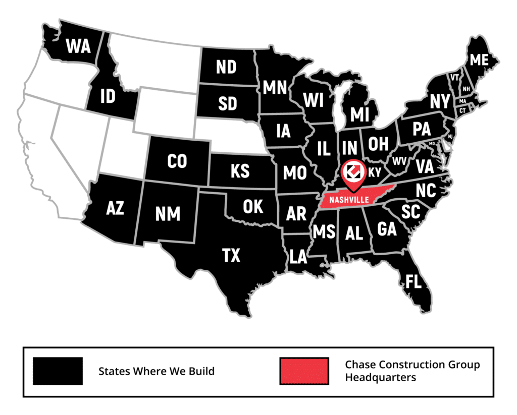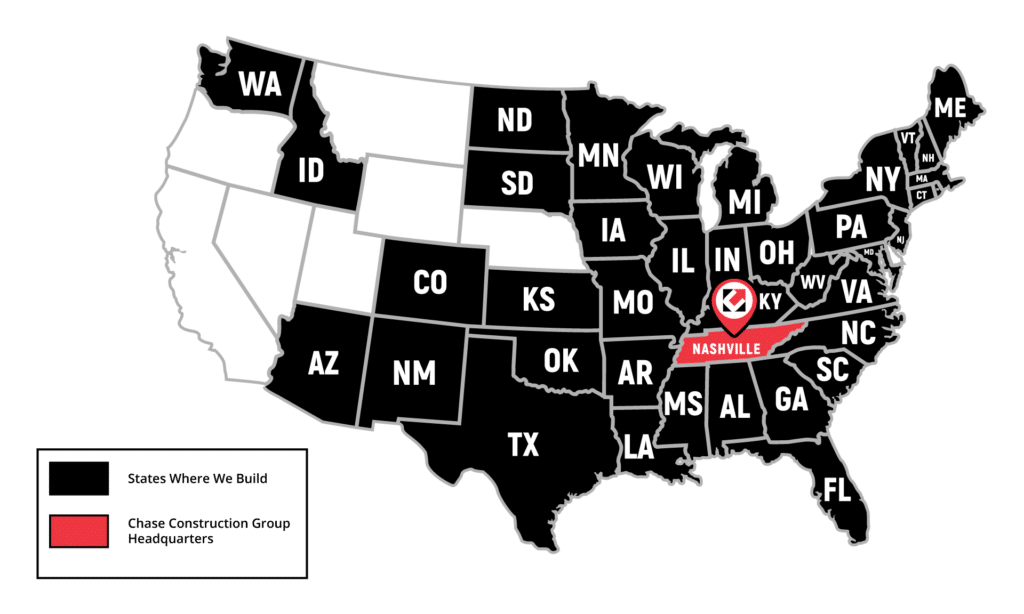 Chase Construction Group, headquartered in Nashville, Tennessee, proudly builds projects across 44 states. Founded in 1986, we’ve built a legacy of quality construction and client satisfaction. In 2022, we became 100% Employee Owned, giving every team member a vested interest in our collective success and reinforcing our commitment to excellence.
